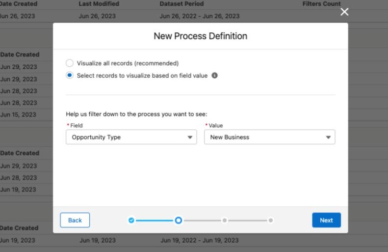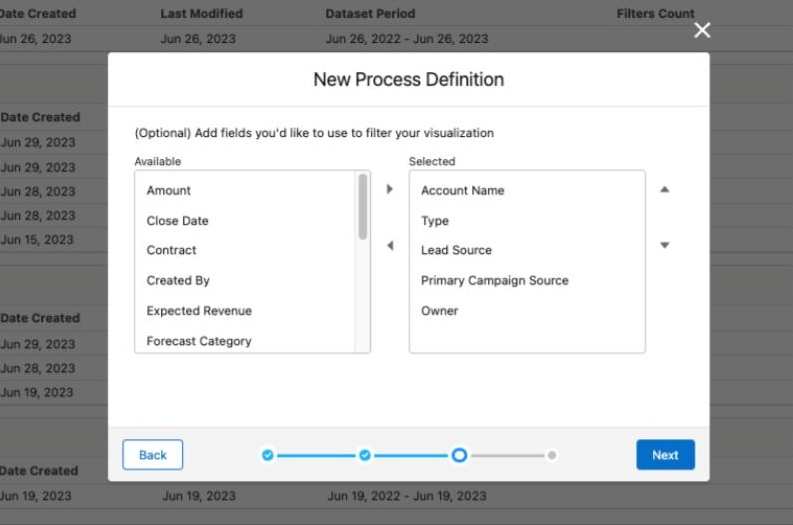 STEP 3: Select fields to filter onA number of attribute fields are added by default and you can add additional fields when you create the process. For example, for Opportunity you may want to add Territory or Expected Revenue if you think they affect performance. Or for Case add Origin or Priority.