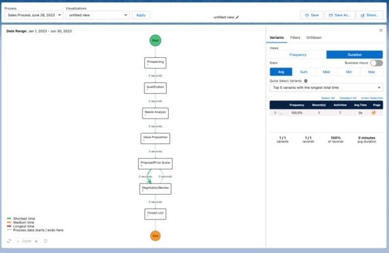 When you open the tool and look at the process, and see which are the most popular variants. Then apply the filters to find the problems you have prioritized.