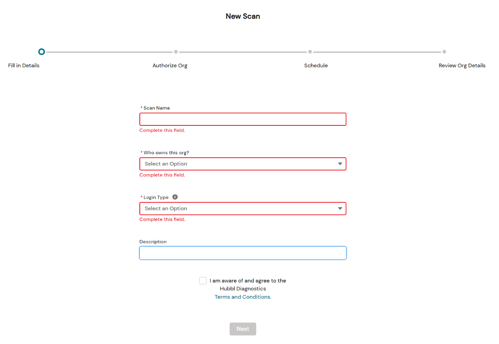 7. Initiate Scan: Click on "Start Scan" to commence the Hubbl Org Intelligence scan on your selected org.
